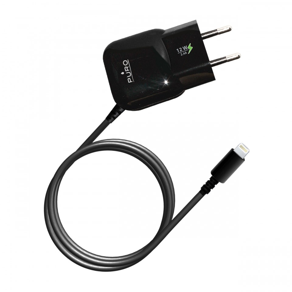 Mini travel charger with Apple cable integrated.Apple-certified, it is ideal for charging iPhone 5/5s, iPod Touch 5 and iPod Nano 7, and it is compatible with all Apple devices with connector Lightning.Equipped with LED light, it is personalized by the Puro logo and it is available in black and white.