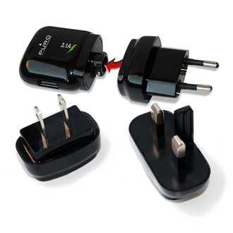 Travel charger with universal USB port, ideal for charging all USB devices through the cable that is not included in the pack. In addition, thanks to the interchangeable plugs, it can be used in Europe, United Kingdom and United States. Available in black and white, it is customized with the Puro logo.