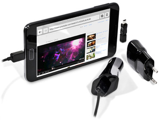 Travel charger, car charger USB, Micro USB power-data cable included and Mini USB connector.