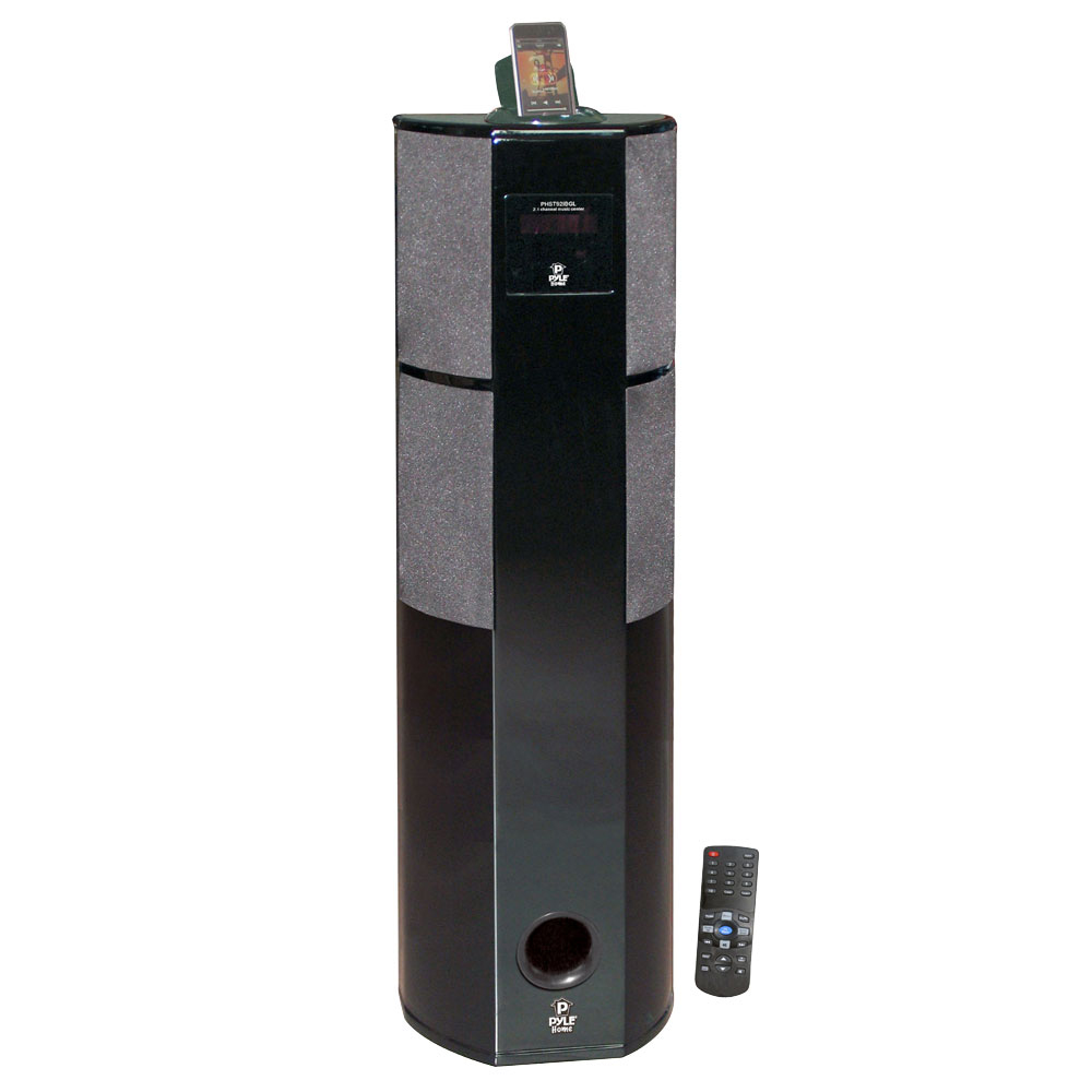This home theater tower brings a beautiful, powerful sound system, iPod player and charger to any room of your home. The 600 watt system is just booming with power, thanks to dual 3.5” tweeters, 3.5” mid-range drivers, and a 300-watt subwoofer that packs a massive punch. Simply plug in your iPod (classic, nano, and touch models are all compatible) and you’re ready to go – plus, this unit charges your iPod, so the party only stops when you run out of music! But when you do, just turn on the built-in FM radio to keep the music flowing. There’s also an alarm clock so you can wake up to your favorite music. Don’t have an iPod? This unit is also equipped with a stereo RCA aux jacks on back – so you can plug in almost anything with stereo sound. Use the front panel touch controls or the included remote to adjust the volume, bass, treble, and even sort through your iPod’s music. The VFD display is bright and crisp, and the black piano wood finish is elegant and clean.