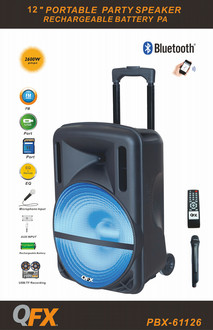 Enjoy your music whenever and wherever you want. The PBX-61126 is a BATTERY POWERED BLUETOOTH PA SPEAKER. This 12" woofer is packed with 2600W PMPO, Microphone and Guitar inputs, and wireless Bluetooth technology.