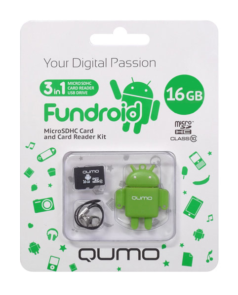 QUMO QM16GCR-MSD10-FD-GRN. Capacity: 16 GB, Flash card type: MicroSDHC, Flash memory class: Class 10. Colour of product: Black, Green, Protection features: Water resistant. Weight: 4 g. Memory adapter included: USB, Package type: Blister