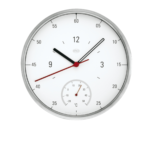 Wall Clock with incorporated receiver for broadcasted time signal provides precise time keeping plus automatic adjustment to daylight-savings time ? no manual setting necessary. Incorporated thermometer for room temperature display (Measuring range -20 °C to +50 °C/-4 °F to +122 °F).
