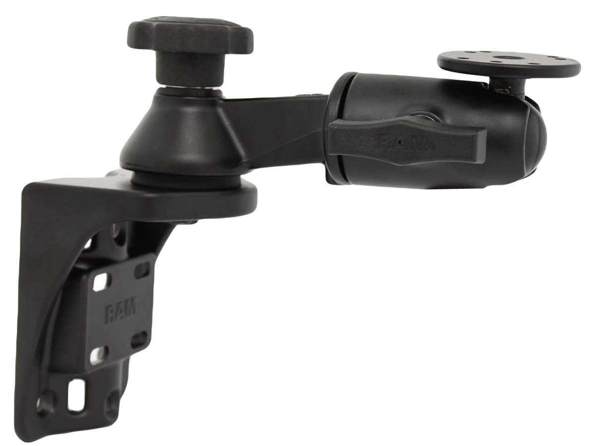 The RAM-109V-3U consists of a 6" long single swing arm, 2.5" diameter round base with universal AMPs hole pattern and vertical surface mounting base. There are two (2) pivoting points on the mount: one at the swing arm and base and one at the center of the round base. Each pivoting point allows a complete 360 degree rotation.