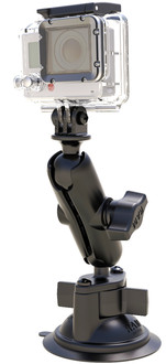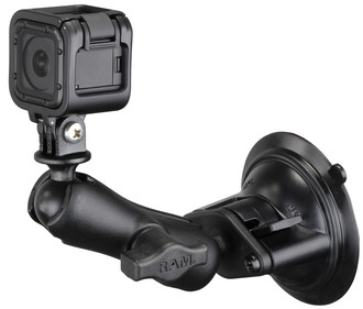 The RAM-B-166-GOP1 consists of a 3.3" diameter suction cup twist lock base, STANDARD length double socket arm and 1" diameter ball with custom GoPro® Hero adapter. The mount is designed with a RAM 1" diameter patented rubber ball and socket system that has adjustment points at both ends of the double socket arm; this allowing for almost infinite adjustment and perfect viewing angles. The suction cup, twist lock base is designed to have a strong hold on glass and non-porous plastic surfaces, including adhesive disks. The GoPro® Hero adapter attaches directly to the under-side of the camera, replacing the factory mounting bracket.