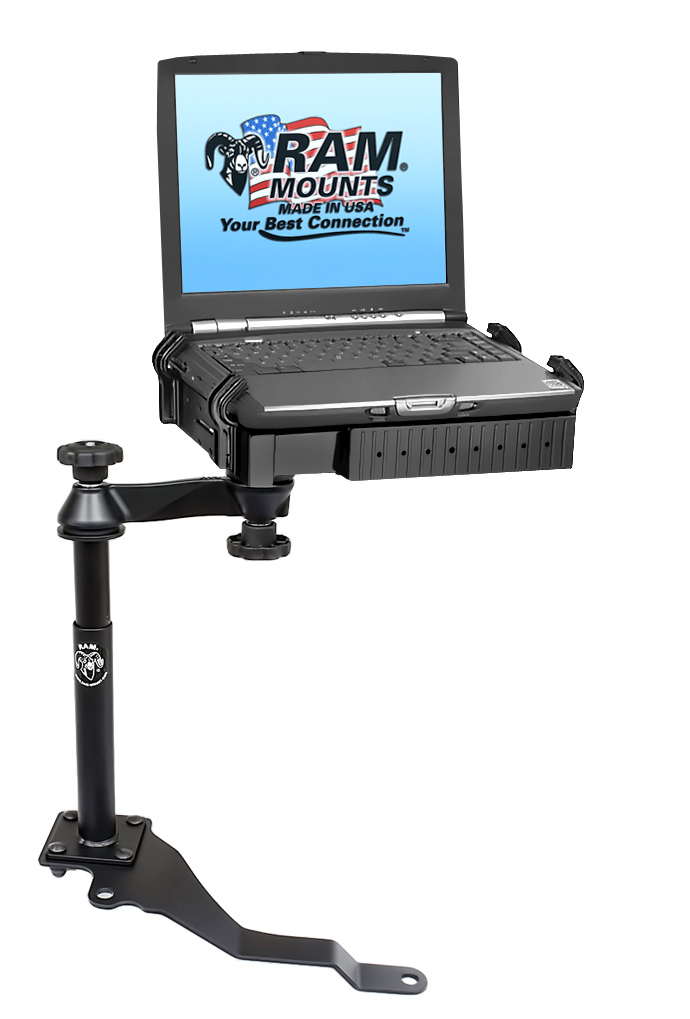 This No-Drill™ Laptop Stand System installs quickly and easily into the specified vehicles using the existing hardware of the passenger side seat rails. This configuration provides a telescoping feature that ranges from 12 to 18 inches. Dual swing arms provide articulation and 12 inches of reach for passenger and driver access to the mounted device. Patented rubber ball and socket joint provides additional adjustment as well as shock and vibration isolation. The RAM Tough Tray™ is spring loaded to accommodate 10" to 16" wide laptops & (17" wide screens). The tray features four adjustable retaining arms with rubber grip feature. These arms can be moved both vertically and horizontally. This allows for a custom fit for varying thicknesses of laptops and the freedom of not blocking ports or drives. A screen support and USB light are also available to accessorize the tray. Hole patterns on perimeter of tray facilitate the mounting of additional RAM systems to support GPS or other electronics.