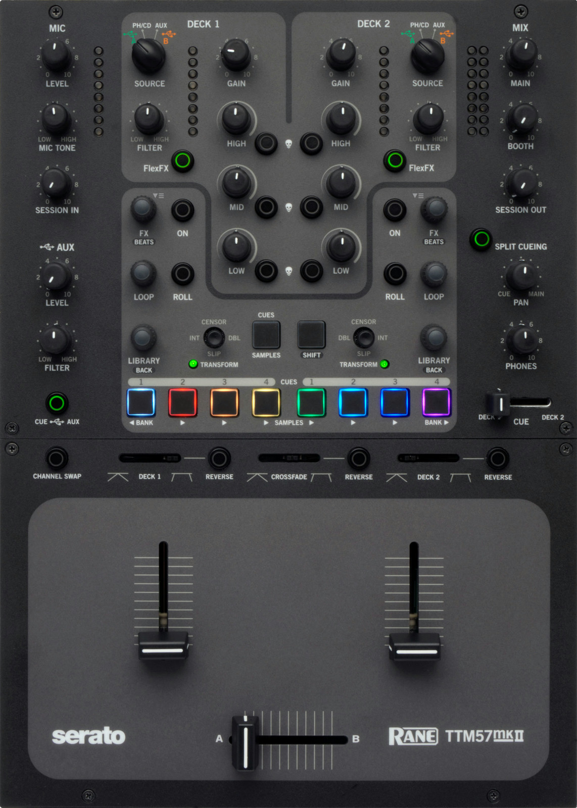 DJ mixer, 2 Deck Bus Controls, 4 RCA jacks, Balanced 1/4˝ TRS & XLR combination jack, USB Audio, Direct Serato Deck Controls