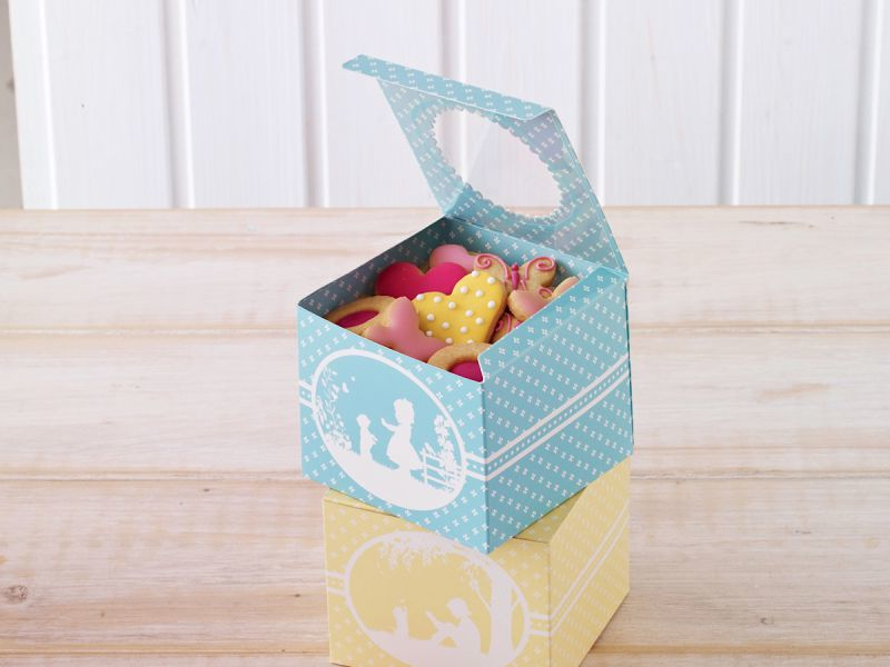 Four decorative gift boxes in Vintage Memories design. Made from high-quality, food-safe printed cardboard with peep window. The cardboard box is also ideal for gift-wrapping other pastries. High-quality packaging, with euroslot