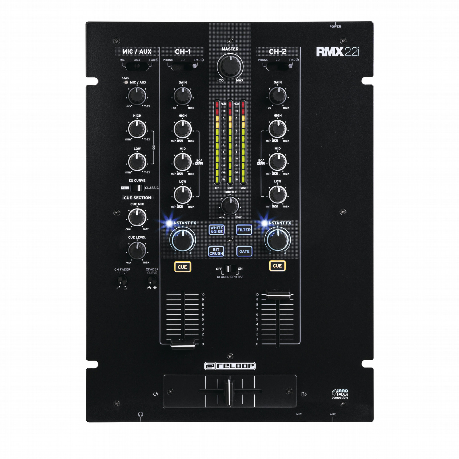 The RMX-22i's high-quality crossfader can also be upgraded with the new Reloop Innofader by Audio Innovate for a truly unrivalled performance at a very appealing price.