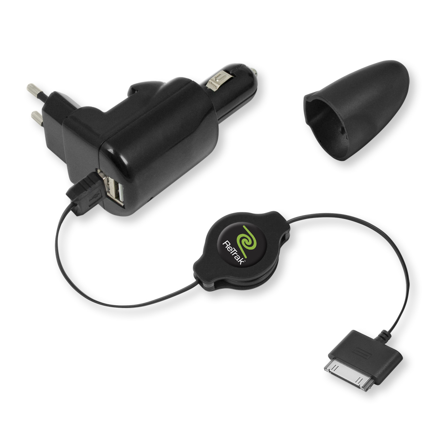 The ReTrak retractable combo charger and sync is perfect for people on the go. The unique design allows you to charge your iPhone or iPod in the car, at home or at the office. With the USB 2.0 connection you can also charge AND sync with any computer. The retractable cable is great for travel yet easily expands to the desired length for without the clutter of unwanted cable.