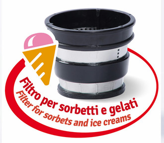 The taste of nature is now at hand! Juice Art New, through the slow and cold squeezing system, lets you obtain juices rich in enzymes, mineral salts and vitamins; the new sorbet filter is suitable to realize fruit ice-creams and sorbets. Space to your imagination for having fancy recipes with fruit and vegetables.