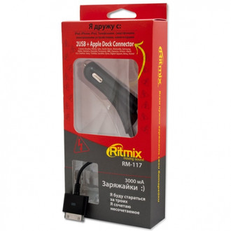 Ritmix RM-117. Charger type: Auto, Charger compatibility: Universal, Power source type: Cigar lighter. Colour of product: Black. Input voltage: 12 / 24, Output voltage: 5 V, Output current: 3000 mA