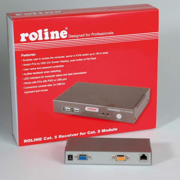 <ul><li>This Cat. 5 Receiver has to be connected to a PC and is dedicated for receiving the KVM signals from Cat. 5 Module 14.01.3031</li><li>Enables user to access the computer, server or KVM switch up to 100 meters away</li><li>A single, inexpensive CAT5/5e/6 UTP cable replaces bulky KVM cables</li><li>Enables user to access the computer, server or KVM switch up to 300 m away</li><li>Collocate computers and servers on one location, ideal for hazardous or unsecured environments</li><li>Switch PCs by OSD (On Screen Display), push button or Hot Keys</li><li>User name and password protection</li><li>Audible feedback when switching</li><li>LED indicators for computer status and data transmission</li><li>Works with PCs with PS/2 or USB port</li><li>Connectors console side: 2x USB for keyboard and mouse</li><li>Easy to install and use with plug-and-play functionality</li></ul><br /><ul><li><b>Contents:</b> Cat. 5 Receiver, power supply, KVM cable, manual on CD</li></ul><br /><ul><li><b>Please order connection cables separately:</b></li></ul>11.01.5521: ROLINE KVM Cable Switch-PC, PS/2, 1.8m<br />11.01.5522: ROLINE KVM Cable Switch-PC, PS/2, 3m<br />11.01.5525: ROLINE KVM Cable Switch-PC, USB, 1.8m<br />11.01.5526: ROLINE KVM Cable Switch-PC, USB, 3m.