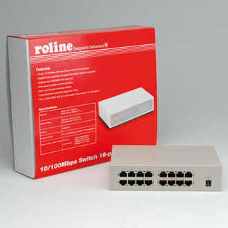ROLINE RS-116D 10/100 Switch, 16 Ports. Switch type: Unmanaged network switch, Switch layer: L2. MAC address table: 8000 entries, Maximum data transfer rate: 0.1 Gbit/s. Data link protocols: Fast Ethernet. Power consumption (typical): 6 W. Data transfer rate: 10 Mbit/s, Dimensions (WxDxH): 184 x 124 x 44 mm, Connectivity technology: Wired