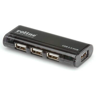 ROLINE USB2.0 Magnet Hub 4-port. Cable length: 0.23 m. Colour of product: Black. Dimensions (WxDxH): 80 x 35 x 13 mm, Power requirements: 5V DC; 2.6A
