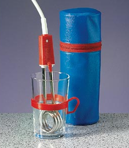 The small immersion heater set for travelling, for the office or for heating small quantities of water at home. The set comprises a heat-resistant tempered glass with a practical grip ring and comes in a convenient coloured zip case (sorted colours). A perfect gift as well!