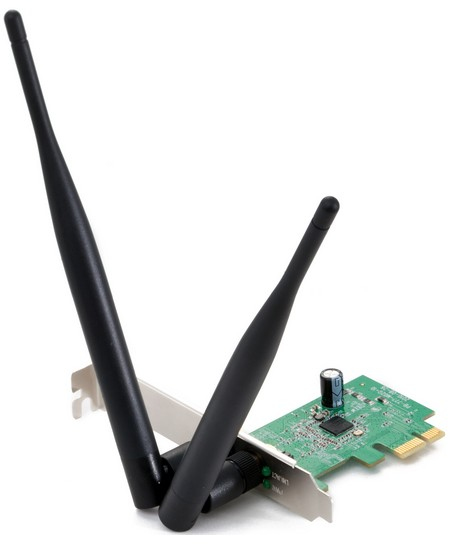 Wireless Adapter IEEE 802.11b/g/n, PCI Express, 300/300Mbps Transfer/Receive Rate, 2T2R, 64-bit/128-bit WEP, TKIP, & AES WPA, WPA2, 2x external detachable 5dBi Antenna