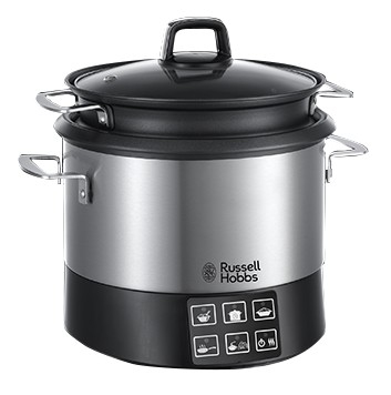 With the Russell Hobbs All in One Cookpot you can create a selection of family meals in one easy to use appliance. Simply choose between the steam, cook rice, slow cook, cook pasta, boil, sauté, cook risotto or keep warm. Because it does so much so efficiently, you may find you don't need as many pots and pans. The non-stick All in One Cookpot has a removable basket to make steaming simple, it also cooks rice and risotto like no ordinary pan can because it has an integral stirring arm to keep your rice moving and ensure fabulous results every time.