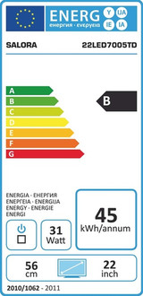 Salora 22LED7005TD. Display diagonal: 55.9 cm (22"), HD type: Full HD, Display resolution: 1920 x 1080 pixels. Digital signal format system: DVB-T, Tuner type: Digital. RMS rated power: 2.5 W. Teletext: 1000 pages, Video formats supported: MPEG4,XVID, Optical disc player type: DVD player. Colour of product: Black