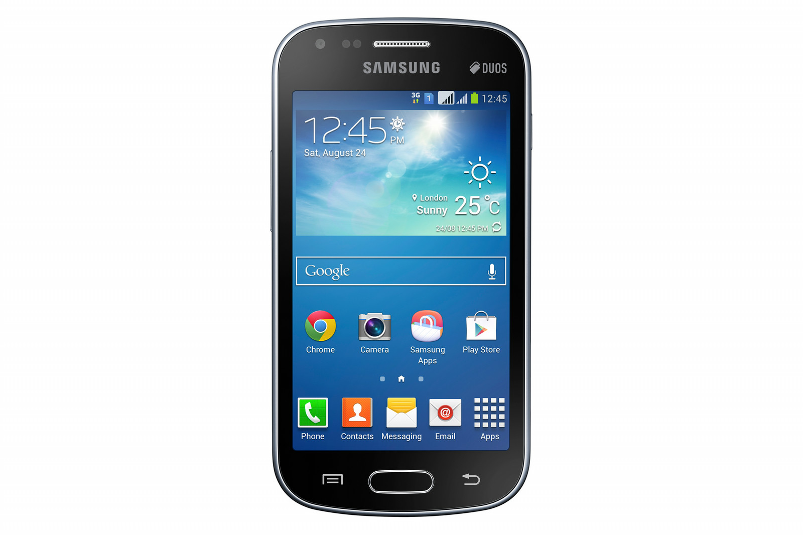 Samsung GT-S7582, Galaxy. Display diagonal: 10.2 cm (4"), Display resolution: 480 x 800 pixels, Display type: TFT. Processor frequency: 1.2 GHz. Internal storage capacity: 4 GB, Compatible memory cards: MicroSD (TransFlash), Maximum memory card size: 64 GB. Rear camera resolution (numeric): 5 MP, Video recording modes: 720p, Maximum frame rate: 30 fps. SIM card capability: Dual SIM, 2G standards: GSM, 3G standards: UMTS