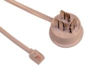 Telephone cable for connecting a telephone, modem, fax or answering machine to the telephone wall socket. The cable has an RJ11 connector at one end and a 3-pin telephone wall plug at the other.