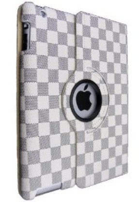 360 Degrees Rotating Stand Case f/ iPad, Leather, White+Gray (checker pattern)