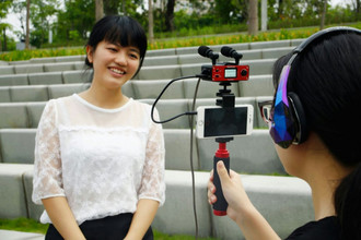 The interface features one mini XLR input for balanced microphones, and two microphone/line inputs for use with the included condenser microphones, or with your own user-supplied microphone. A volume control knob and level meter allow easy adjustment of the input level, while a headphone monitor output allows you to monitor the input and playback signal.