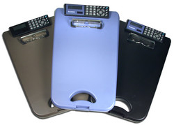 Great New Colors! - Durable polypropylene construction. - Solar powered and battery operated calculator. - Bottom opening for convenient access. - Strong low profile clip with rubber grips holds up to 1/2" paper securely.