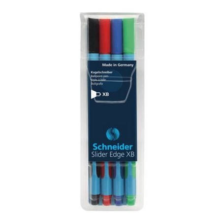 Ballpoint pen with Viscoglide® technology for extraordinarily easy and gliding writing. Wallet with 4 pieces: black, red, blue and green. Extra broad line width (XB). The ink dries quickly - even on smooth paper - and is smudge proof when highlighting it later on. The black ink is waterproof according to ink standard ISO 12757-2. Ideally suited to drawing and painting projects because the special ink will not run even on absorbent paper. A generously rubberised three-sided barrel is designed for relaxed writing without hand fatigue. It does not roll on the desk and its slim shape fits perfectly into school children's pencil cases or into desk pen drawers. The cap fits neatly on either end of pen. The wear-resistant stainless steel tip guarantees that the large ink supply can be fully used and does not smear. The Slider Edge is produced CO2 neutral.