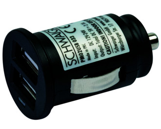 This SCHWAIGER® charger is connected to the cigarette lighter in the car. It is equipped with two USB jacks which allow for simultaneously charging two devices (such as smart phones, tablets or cameras). Simply use the USB cable of the respective device.