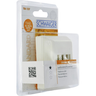 This SCHWAIGER® TAE connector socket is suitable for connecting a telephone and two additional devices, e.g. answering machine and fax. The socket was designed for on-wall installation.