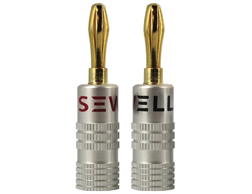 Silverback Banana Plugs, 24k Gold Dual Screw Lock Speaker Connector, 12 Pairs These Silverback banana plugs have the quality you’ve come to expect from Sewell, including; gold plated connectors, a heavy duty, but light casing, and a tight cable-screw design. What sets these banana plugs apart is its unique 2 screw lock design. This connection will secure your cable more than a single screw, or open screw design. Dual screw connectivity provides a secure connection, durability, and the most crisp and clear signal possible with more signal transmission through contact. Our best banana plug yet!