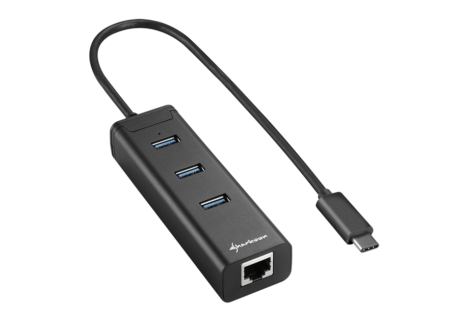 The elegant Sharkoon 3-Port USB 3.0 Aluminium Hub allows comfortable expansion of three additional USB 3.0 ports as well as a RJ45 connector. The integrated Ethernet adapter provides Gigabit Ethernet and is therefore well prepared for integration into fast networks. The external hub is available in both black and silver.