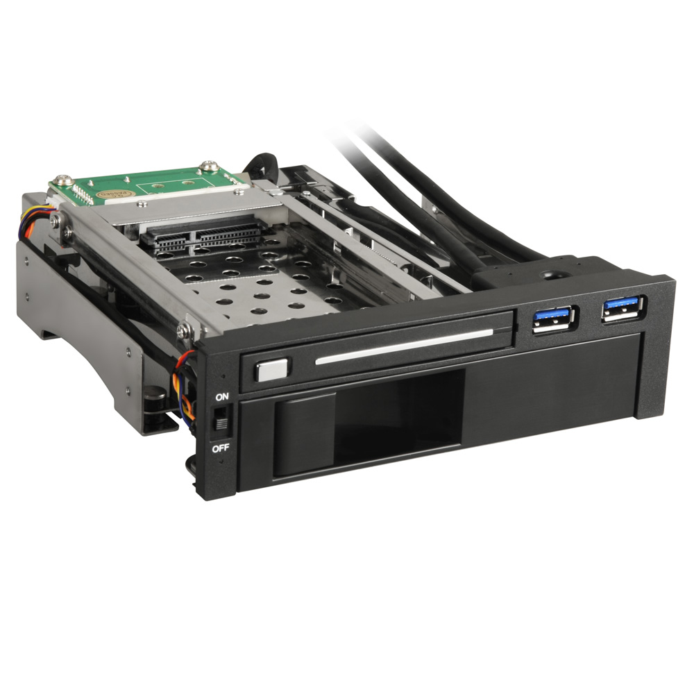 Power is supplied by the direct connection of the docking station to a SATA power connector from the power supply. The dock, which is inserted into a 5.25" drive bay of a PC case, also offers two USB3.0 front ports which are connected to a corresponding mainboard connector (19-pin). The docking station is decoupled by special rubber buffers mounted in the case so that the vibrations of the disks are not transferred to the case's body. The SATA QuickPort Intern Multi includes a switch turning on/off both hard drives.