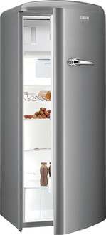 SIBIR Oldtimer OT 272. Case design: Freestanding, Colour of product: Metallic, Stainless steel, Door hinge: Right. Total net capacity: 281 L, Climate class: SN-T, Noise level: 42 dB. Fridge net capacity: 255 L, Lamp type: LED. Freezer position: Top-placed, Freezer net capacity: 26 L, Freezing capacity: 2 kg/24h. Energy efficiency class: A++, Connected load: 90 W, Annual energy consumption: 196 kWh