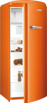 SIBIR Oldtimer OT 272. Case design: Freestanding, Colour of product: Orange, Door hinge: Right. Total net capacity: 281 L, Climate class: SN-T, Noise level: 42 dB. Fridge net capacity: 255 L, Lamp type: LED. Freezer position: Top-placed, Freezer net capacity: 26 L, Freezing capacity: 2 kg/24h. Energy efficiency class: A++, Connected load: 90 W, Annual energy consumption: 196 kWh