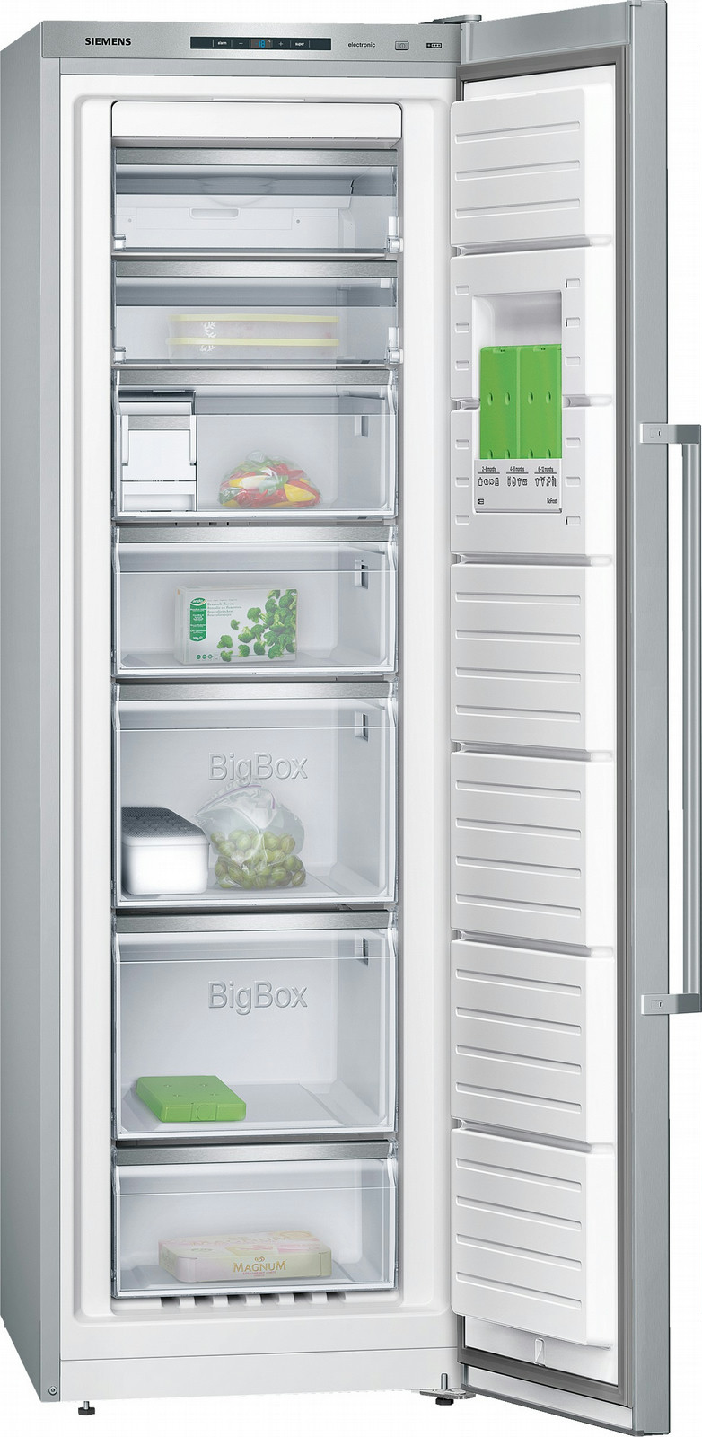 Siemens GS36NMI31. Case design: Freestanding, Type: Upright, Colour of product: Silver. Freezer net capacity: 237 L, Freezing capacity: 20 kg/24h, Storage time during power failure: 25 h. Lamp type: LED, Cord length: 2.3 m. Energy efficiency class: A++, Annual energy consumption: 234 kWh, Connected load: 90 W. Width: 600 mm, Depth: 650 mm, Height: 1860 mm