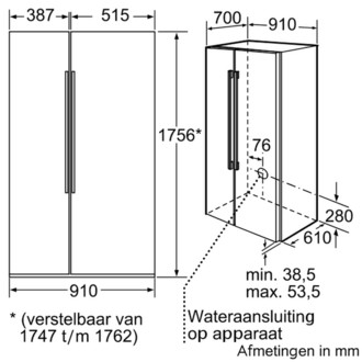 Siemens KA62DS20. Case design: Freestanding, Colour of product: White, Built-in display: LCD. Total net capacity: 533 L. Fridge net capacity: 355 L. Freezer net capacity: 178 L, Freezing capacity: 12 kg/24h, Storage time during power failure: 16 h. Energy usage: 1.28 kWh/24h