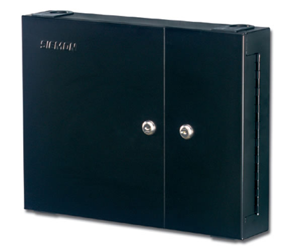 24- to 96-port Wall Mount Interconnect Center with integrated jumper guard, black. Includes dual-level fiber managers, port designation labels and removable pocket, dust-proofing grommets, strain relief hardware, cable ties, and mounting hardware.