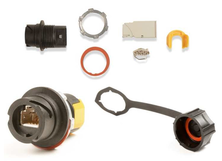 - Outlets include ruggedized housing, gasket, locking nut, outlet/termination module and securing clip