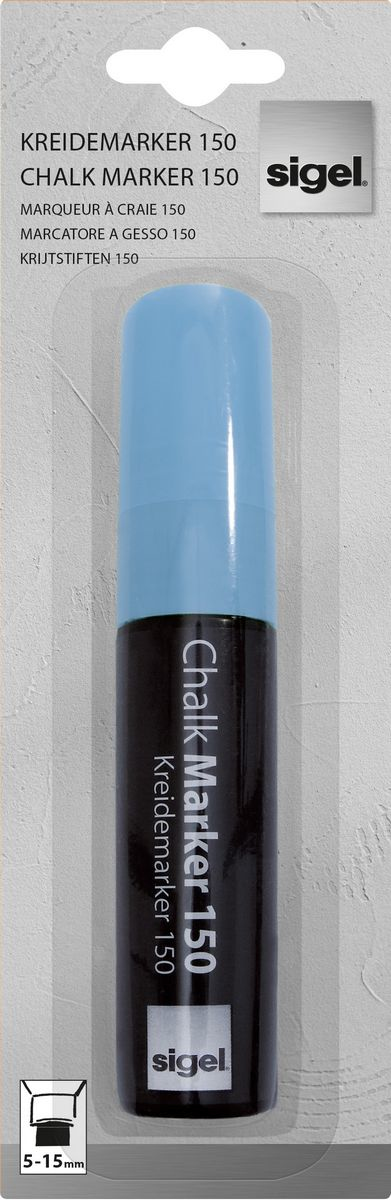 The blue chalk marker 150 with the 5-15 mm chisel tip writes with opaque liquid chalk and is suitable for use on smooth glass and almost all sealed surfaces. The water-based chalk can be wiped off with a damp or dry cloth.