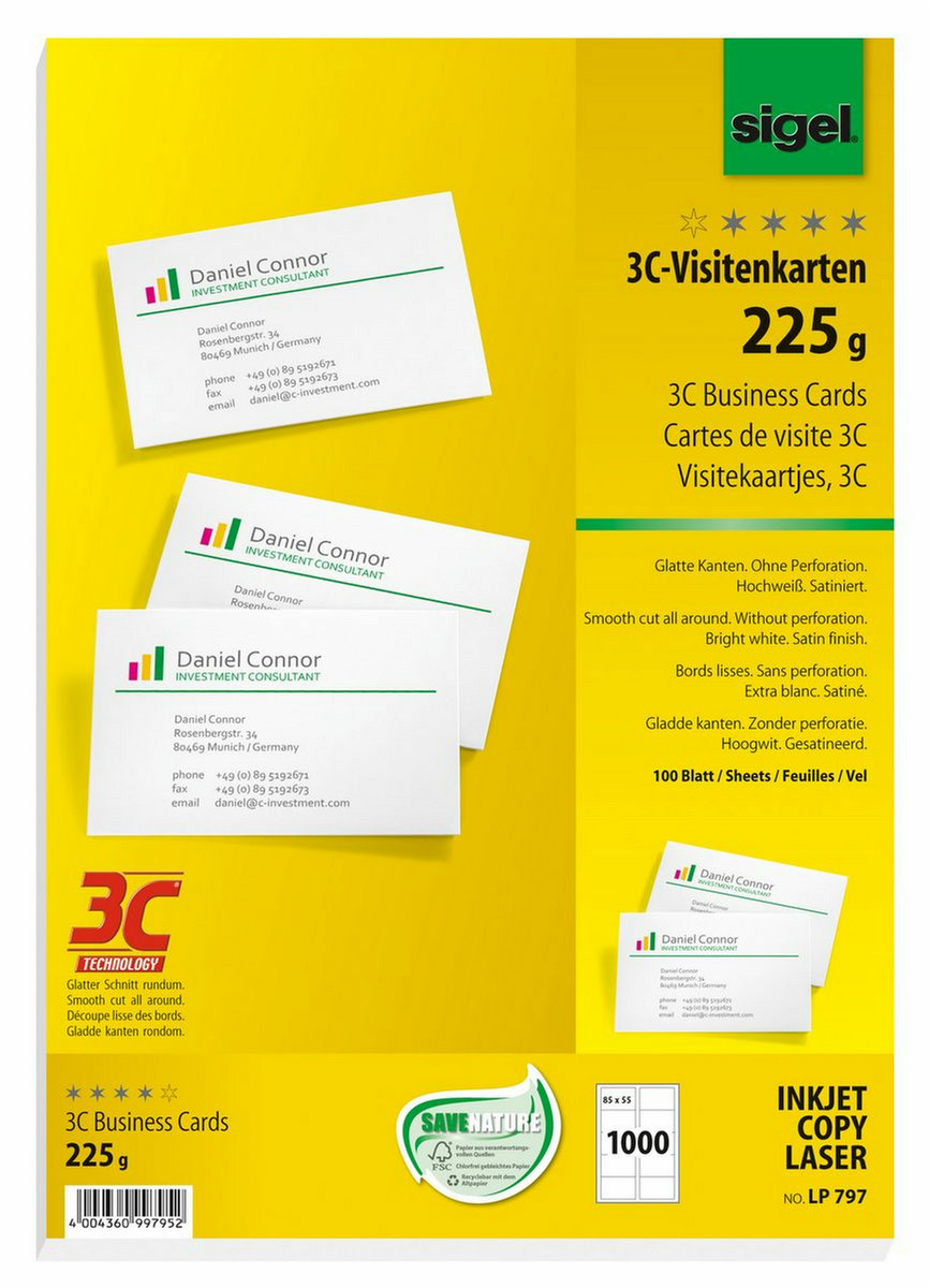 PC business cards, bright white, satin finish, 225 gsm, FSC®-certified. The fast, simple way to design and print business cards with your own PC and printer. Simple to detach from the backing sheet due to the 3C technology: clean cut all around without perforations. The business cards are extremely practical, e.g. for events, trade fairs or exchanging personal details, both in the professional and private sphere. Suitable for all inkjet and (colour) laser printers and copiers. The pack contains 100 A4 sheets for a total of 1000 cards, 85x55 mm.