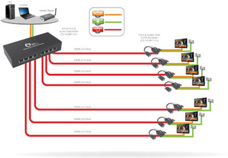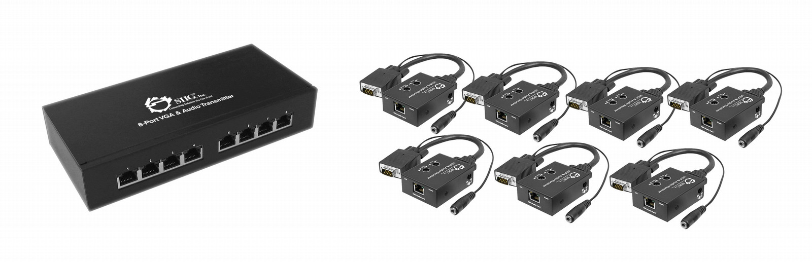 The SIIG VGA 7-Display Native Extender Kit is designed for digital signage environments requiring multiple displays, where the audience is decentralized in multiple area locations. This kit includes an 8-Port VGA & Audio Transmitter and seven VGA & Audio Receiver units to enable A/V signal distribution to 7 LCDs or display monitors. With this kit, you can reliably duplicate and extend your high-definition analog signal with stereo audio over economical CAT5e/6 from a VGA source to multiple VGA displays in different locations.