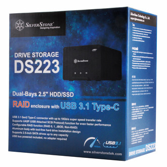 SilverStone DS223 is an external hard drive enclosure made to accommodate 2.5" drive at speeds up to 10Gb/s with its USB 3.1 Gen2 Type-C connector. A wide range of operating modes such as RAID 0, RAID 1, JBOD, and Non-RAID are supported to enable installed drives to be used for data security or extra performance. For enthusiasts or professionals requiring even greater performance, the DS223 is also equipped with UASP (USB Attached SCSI Protocol) so those with computers that support it can take their data transfer rate up another level. For those that need a simple and convenience way to save and manage big data, the DS223 is a great choice.