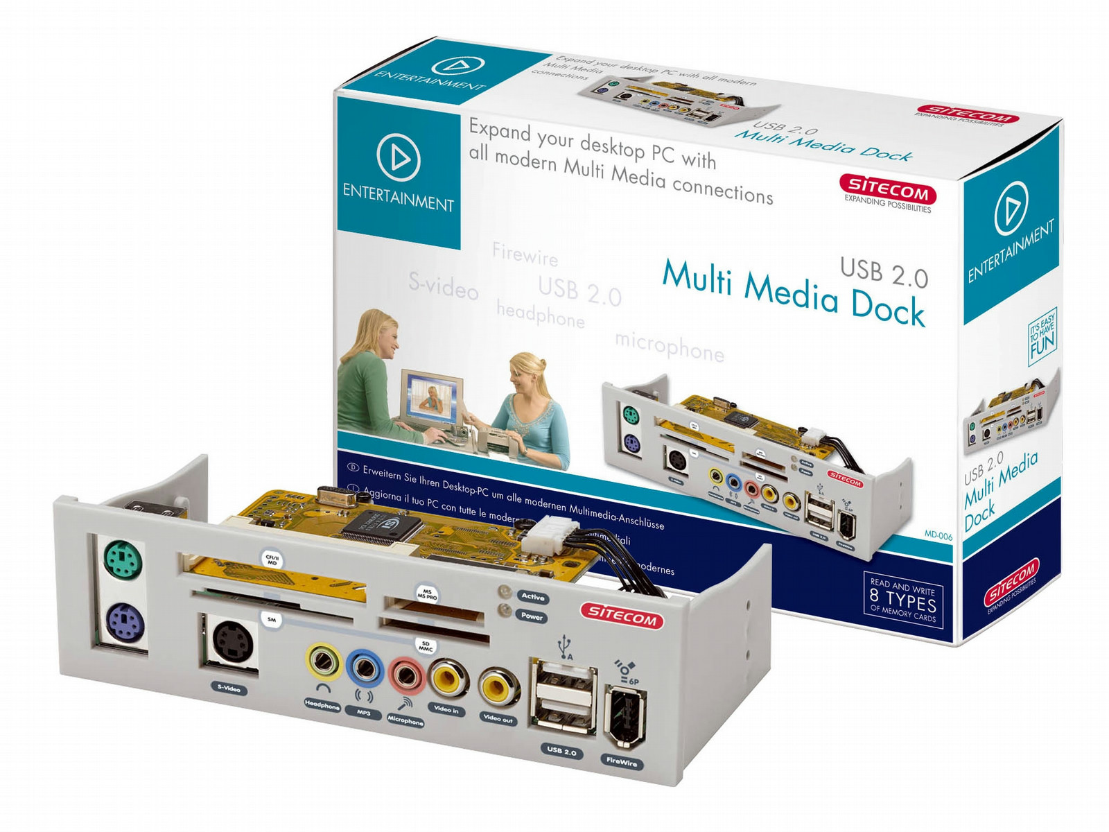 The Sitecom Internal card reader dock is a multifunctional docking station. It enables you to read and write data easily to and from the most popular types of memory card via your PC. In addition to the card reader, the Internal card reader dock has 2 USB 2.0 ports and a firewire port, giving your PC the latest connection standards once it is installed. The Internal card reader dock also has a video in- and output, an S-video port and 3 ports for connecting a microphone, headphones and, for example, your MP3 player or Discman.