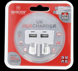 The UK USB Charger from SKROSS ensures full batteries on all USB devices. The dual USB port in connection with the exceptional performance capability of 2100mA enables two USB devices to be charged simultaneously.