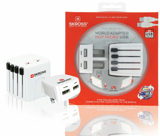 The World Adapter MUV Micro from SKROSS with dual USB charging functionality is the most compact 2–pole travel adapter for travellers from all over the world. The patented country slider system guarantees simple and safe connection in over 150 countries on all continents – irrespective of the socket standard. The Original World Adapter MUV Micro USB from SKROSS for travellers from all over the world to more than 150 countries is equipped additionally with a powerful dual USB charger. Therefore unearthed 2-pole appliances can be safely connected as well as all USB devices can be charged at the electrical socket. Integrated fuse.