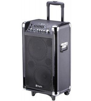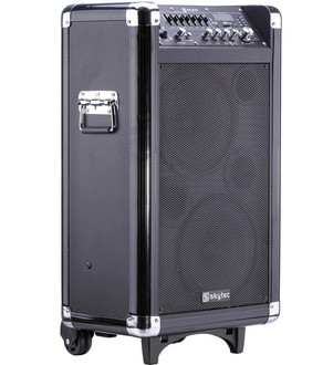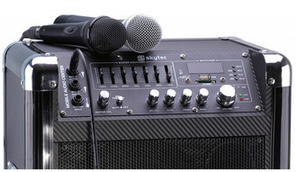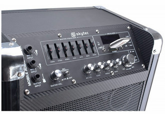 Enjoy your favorite music with this sound system with dual woofers and tweeters. The complete portable system includes everything you would expect such as amplifier, audio inputs, a 7-band equalizer, a USB port and SD slot, a VHF microphone set and a BT receiver for streaming audio. Even inputs for a wired microphone, instrument, CD and MP3 player are present. Due to the various functions on the portable system files can be directly played-back and controlled. There is also a built-in battery with a load protection system. Comes with flip handles and retractable tophandle. A perfect system for organizers of events and parties as well as for musicians, DJs and entertainers. Supplied with 1 VHF handheld microphone and 1 wired handheld microphone.