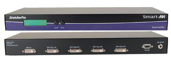 SmartAVI’s StretcherPro is a digital signage / display wall controller that can take any DVI-D source and stretch it among four VGA or DVI displays. StretcherPro supports the highest resolution available (1920 x 1200) on the market for single link DVI-D. Each of the four screens displays 1/4 of the image in a 2 x 2 format, using real-time scaling.