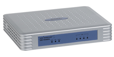 The ADSL Barricade™ (SMC7904BRA) is an external Ethernet standards based ADSL2/2+ modem and Router that provides high-speed internet access to both the residential and the small and home office (SoHo) user. This new Modem/Router provides unrivaled asymmetric high-speed data transport over a single copper pair linking branch offices, home offices and individual subscribers to their network services providers, including internet service providers. The SMC7904BRA also has a built in DHCP server to make implementing and expanding your network simple and easy. This device supports Full-rate G.dmt, which gives you download speeds of 12Mbps and upload speeds of 896Kbps. Its NAT based Firewall security provides a high level of security for your network. This new device is a complete ADSL solution for PC or MAC users. Graphical user interface software is provided for easy installation, configuration, and management. The LED display panel on the front of the product shows at-a-glance the Ethernet activity, ADSL status and Power.